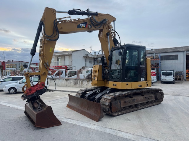 Excavadora de cadenas de hierro con tacos de goma, CATERPILLAR 315FL, año 2017, con solo 3500 horas, aire acondicionado, cámaras, peso operativo 15.500kg, equipada con cazo inclinable, y cazo de 80, quinta botella, enganche hidráulico, instalación de martillo y pinza. CE, máquina en impecable estado, pintura original, entrega inmediata.