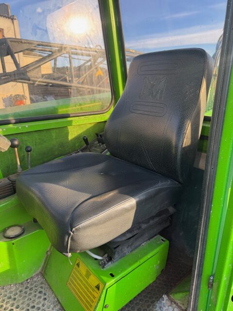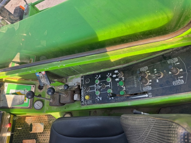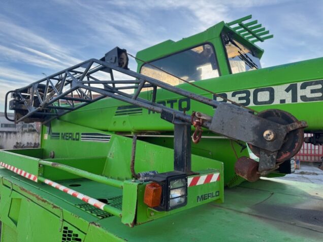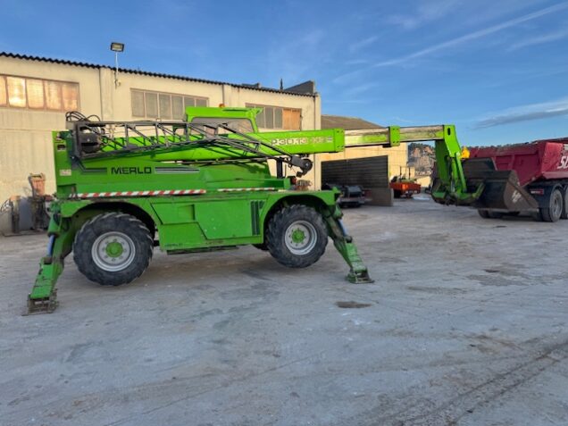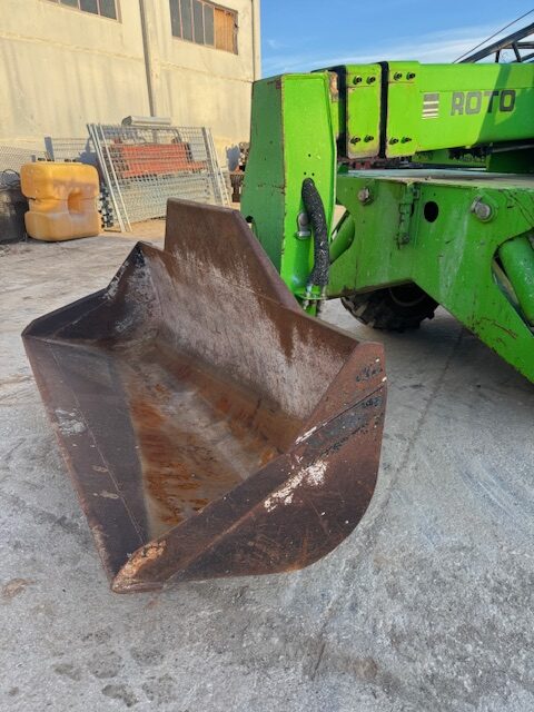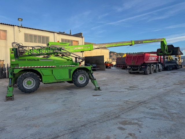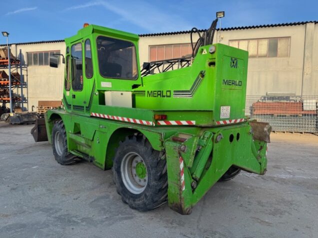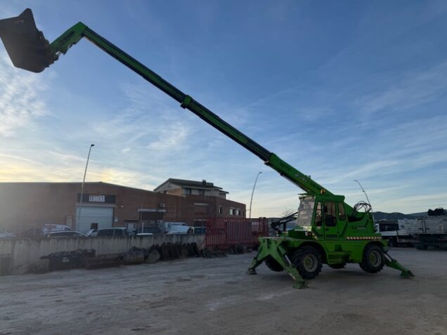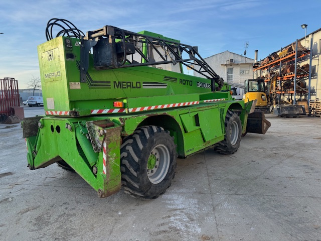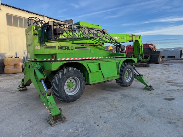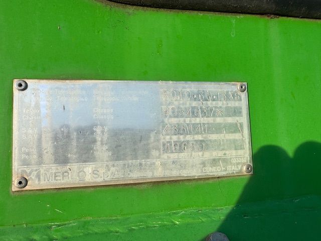 Telescópica giratoria MERLO modelo ROTO 30.13XS, capacidad elevación 3000kg, altura máxima elevación 13m, equipada con pala y plumín con cabrestante hidráulico, año 1995, 5000 horas de trabajo, maquina en muy buen estado, ruedas al 80%, matriculada y lista para trabajar.