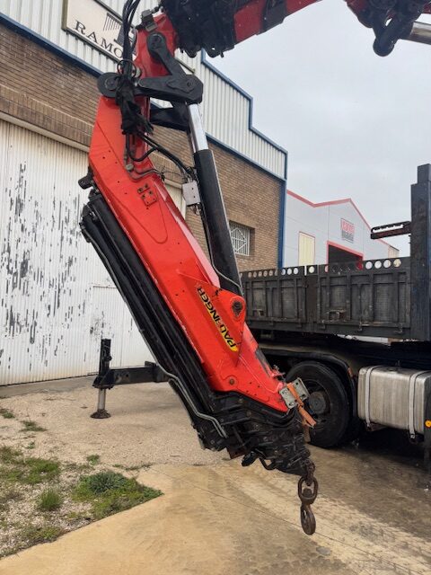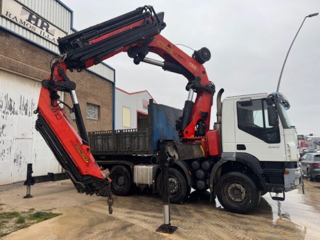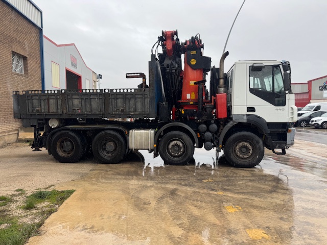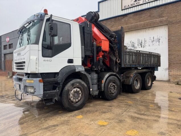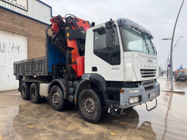 TRACTORA 8×4, IVECO TRAKKER 440, año 2006, tara 21.410kg, 114.000km, equipado con grúa PALFINGER PK56.002 del año 2003 con 6 salidas hidráulicas y JIB con 6 salidas hidráulicas, cabrestante. Caja extensible hidráulicamente. ITV al día, ruedas al 80%.